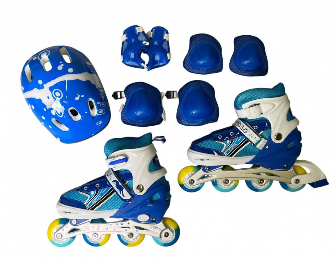 - Набор роликов с защитой и шлемом M08047 — это комплект детских роликовых коньков, который включает в себя ролики, шлем и средства защиты (наколенники, налокотники).