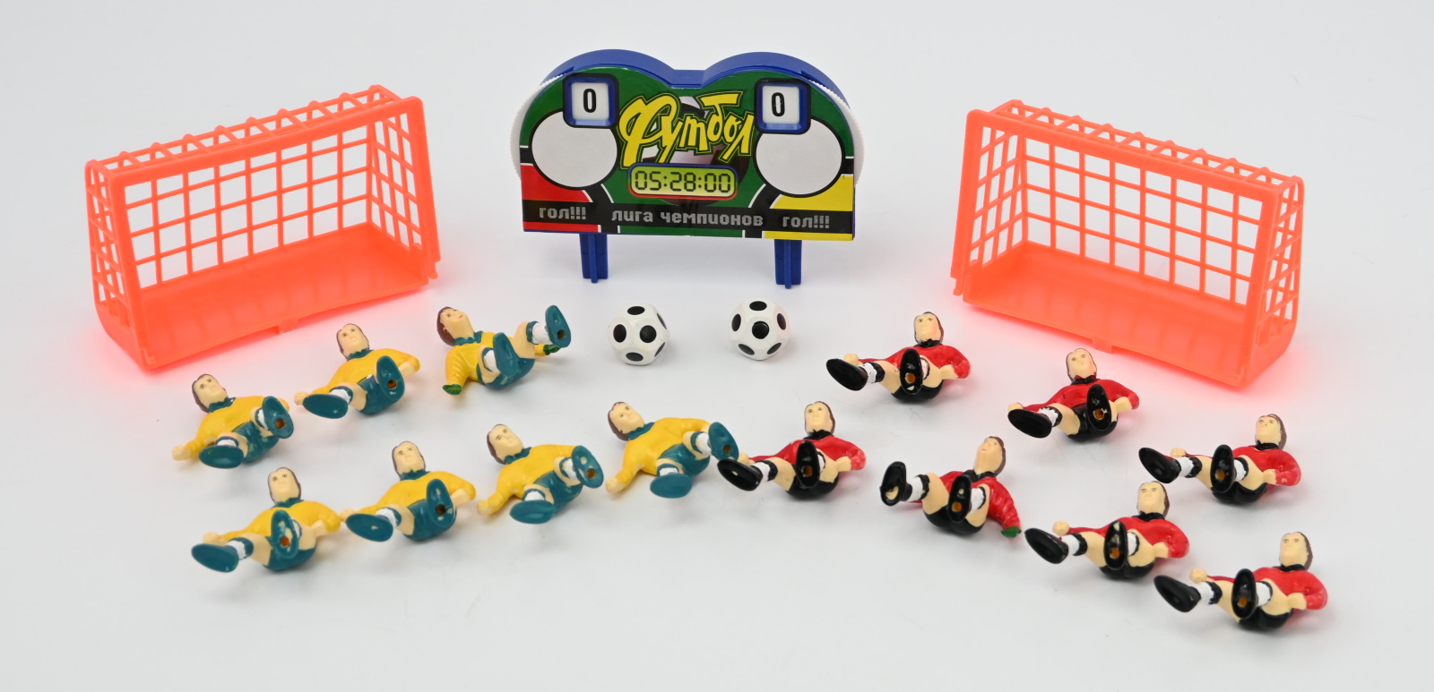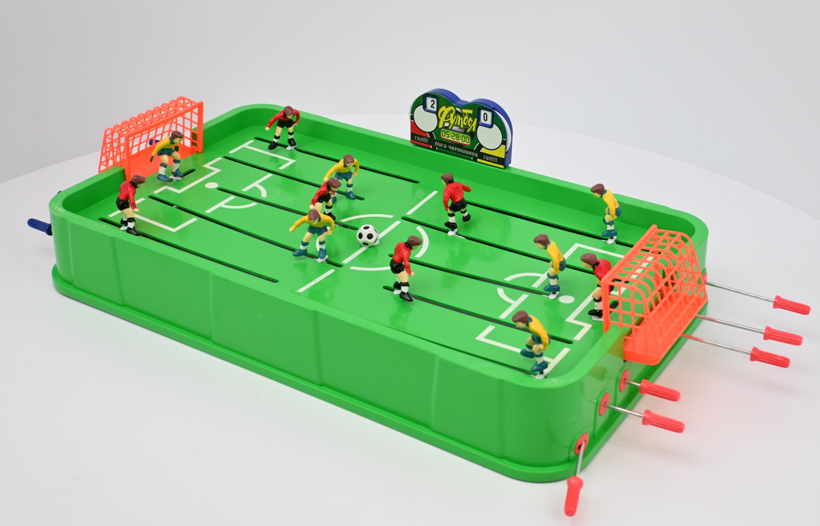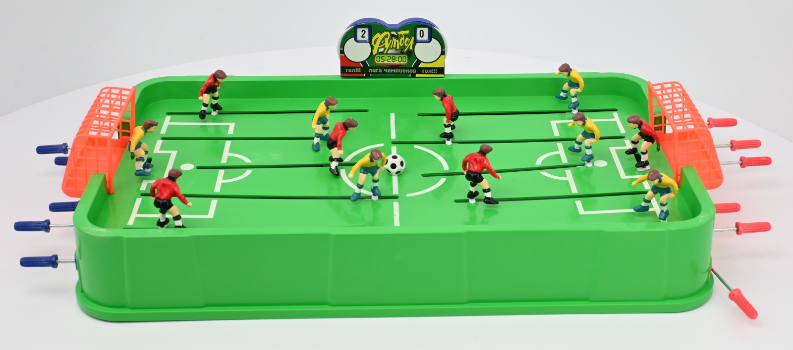 Как играть: выбрав команду, нужно установить мячик на середину поля и попытаться забить сопернику гол, управляя игроками при помощи специальных ручек.Размер82*42*18смКод товара081020Вес с упаковкой, кг0Длина игрушки, см0Ширина игрушки, см0Высота игрушки, см0Вес игрушки, кг0Минимальный возрастОт 6 летМаркировка0Комплектацияфутбольное поле, ворота (2 шт.), 2 мяча, 14 фигурок, наклейки