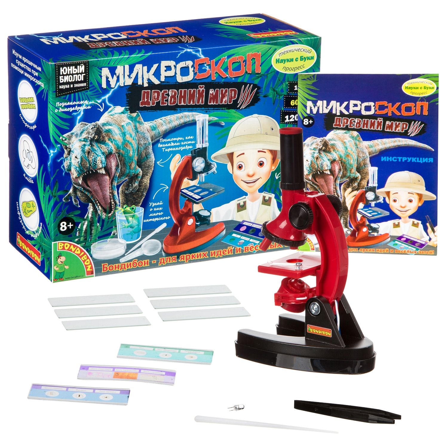 - Микроскоп «Древний мир: Динозавры» Bondibon (артикул ВВ4201) — это набор для научных исследований, который позволяет изучить строение костей динозавров, материалы древних растений и насекомых.