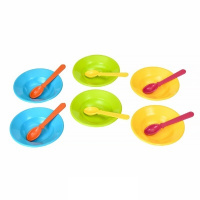 Комплектация: 6 разноцветных тарелок размером 5 см и 6 ложек длиной 8 см.