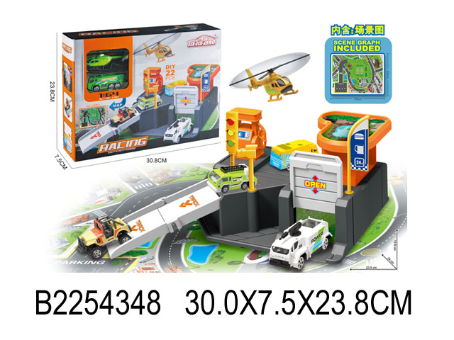 - в комплекте: полимерная плёнка с изображением декораций (78 × 58 см), 2 модели транспорта с металлическими элементами (7,5 × 3 × 3 см);