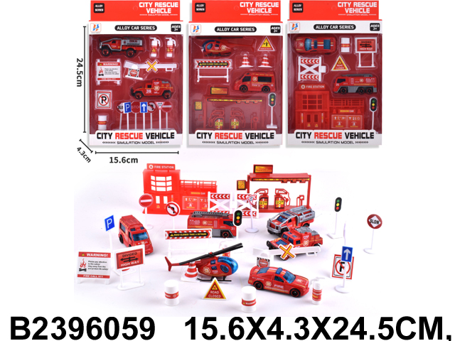 В наборе представлены: легковая машина, пожарная машина с автолестницей, пожарная станция (имитация), а также дорожные знаки и указатели. У машинок крутятся колёса и поднимается спасательная лестница.