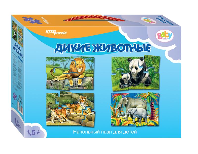 - «Напольный пазл „Дикие животные“» (артикул 70104) — развивающая игрушка для детей от 1,5 лет.
