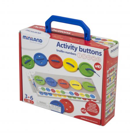 - MINILAND Набор обучающий со шнуровкой Activity Buttons в чемоданчике 31791 — развивающий набор для шнурования. Игра представляет собой набор из крупных цветных пуговиц и шнуров. На каждой пуговице изображено число и его эквивалент в виде Брайлевского символа. Количество отверстий совпадает с изображённым числом. Ребенку предлагается повторить последовательность пуговиц с карточек-заданий.