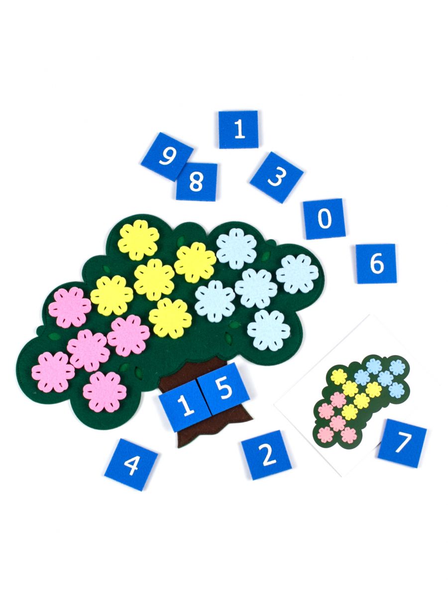 Описание: игрушка представляет собой игровую основу в форме дерева, комплект фигурок цветов и набор цифр на липучке, карточки со схемами. Задача ребёнка — прилеплять цветочки на дерево в соответствии с цифровым обозначением или повторять изображения карточек со схемами.