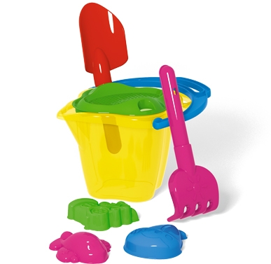 Состав набора: прозрачное ведро-кувшин объёмом 1,1 л (19х16х12,5 см), сито (14х14 см), лопатка 19 см, грабли 19 см, 3 формочки.