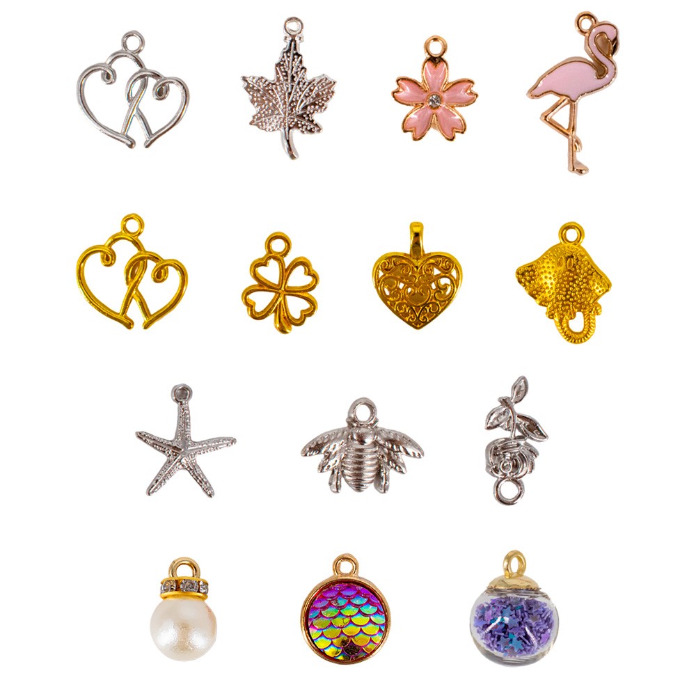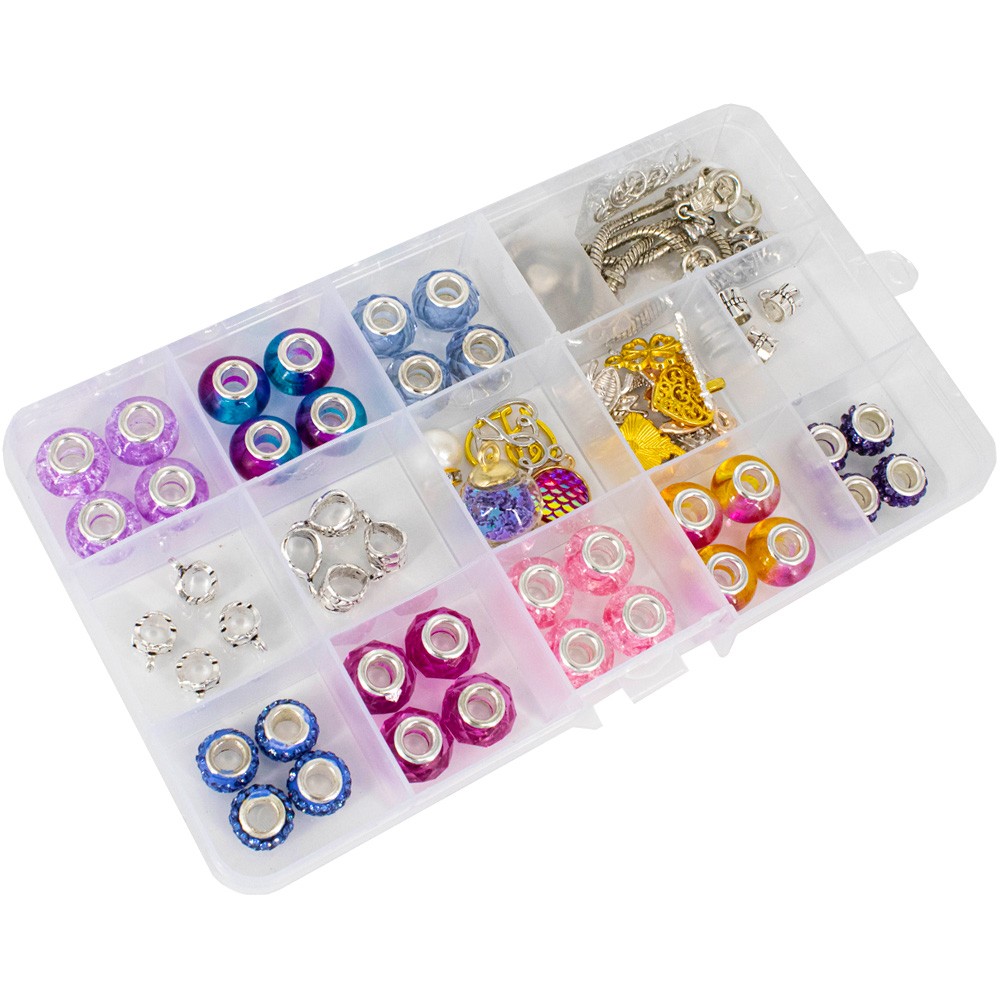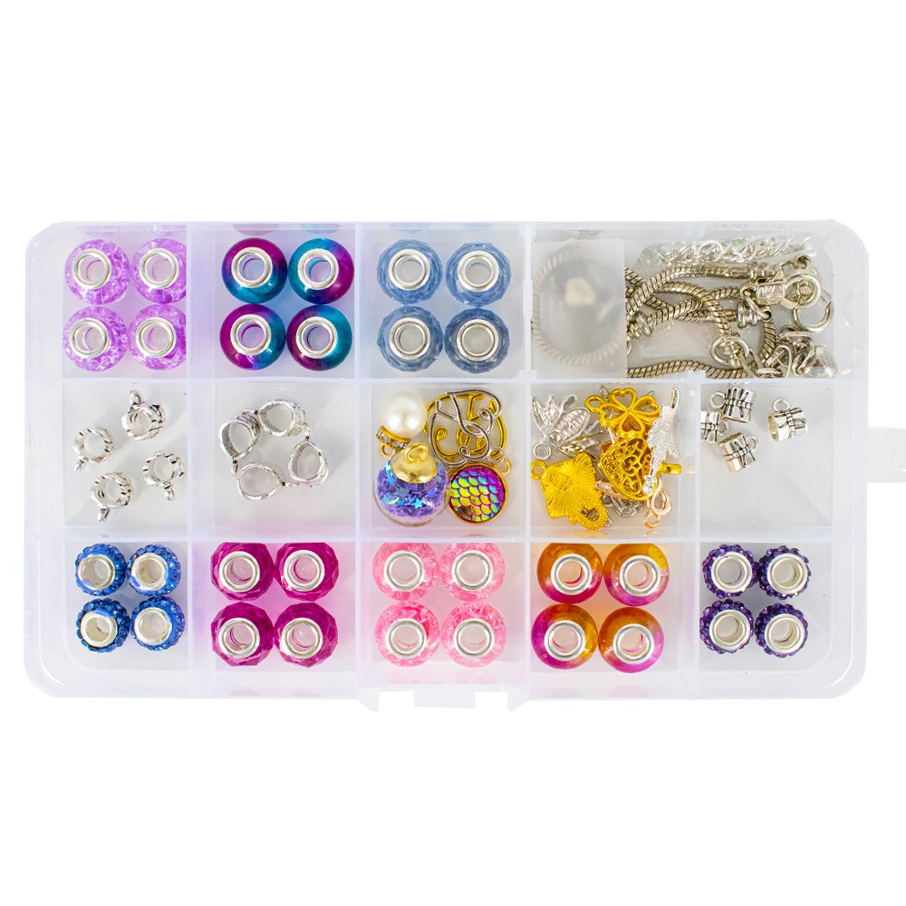 - Комплектация: бусины в виде шаров (8 видов), подвески-украшения (5 видов), основа для браслета.