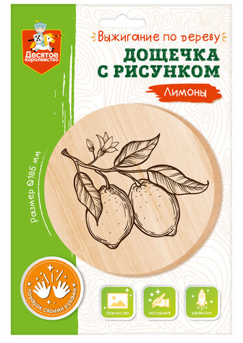 - Дощечка для выжигания «Лимоны» с артикулом 04464 — это набор для творчества от бренда «Десятое королевство». Она предназначена для освоения техники выжигания по дереву и развития творческих навыков.